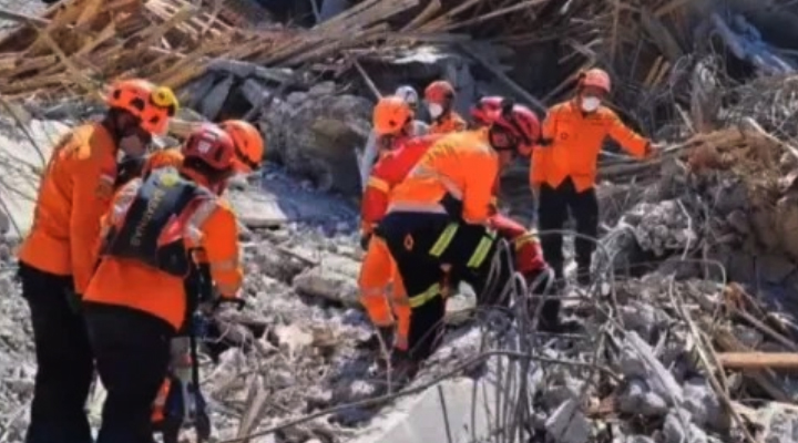 Alat berat, termasuk crane, eskavator, dan breaker, dikerahkan untuk mengevakuasi korban dari reruntuhan yang berserakan.